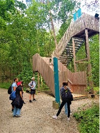 Wie viel CO2 geben die Berliner*innen pro Kopf im Schnitt im Jahr in den ökologischen Fußabdruck der Stadt? Wie viel Bäume müssten für die Kompensation gepflanzt werden? Dieser und vielen weiteren Fragen konnten wir auf dem Klimapfad im Grunewald nachgehen. Biologieunterricht am Ende des Halbjahres, der das Themenfeld Ökologie und Nachhaltigkeit der 7. Klassen noch einmal anschaulich und „begreifbar“ unterstrich. Neben der Trinkwasserverkostung vom Waldbrunnen lernten wir Moore kennen wie z.B. der Pechsee, der noch in den 1950er Jahren zum erfrischenden Bad einlud. Beide Aspekte hängen miteinander zusammen: Je mehr Trinkwasserbrunnen die Berliner benötigten, desto mehr sank der Grundwasserspiegel der Umgebung. Was zunächst Pech für den Pechsee war, stellte sich in diesem Fall ökologisch als Glück heraus: eine einzigartige Moorlandschaft entstand mit entsprechend seltenen Tier- und Pflanzenarten. Ein kulinarischer Abschluss am Fuße des Grunewaldturms durfte natürlich nicht fehlen. Mit Eis und Pommes gestärkt traten wir den Rückweg an.