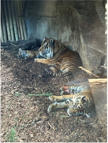 Sie hatten ein dickes orange-braunes Fell und am liebsten hätten wir stundenlang mit ihnen gekuschelt, weil sie so knuffig aussahen! Zwei Geparden lagen in der gleichen Position nebeneinander und schliefen; der andere lag wie tot auf der Seite und döste ebenfalls. Ab und zu bewegte er seine Pfote, vielleicht träumte er ja von einer erfolgreichen Jagd. Im Raubtierhaus angekommen, war das Highlight die königlichen, anmutigen Tiger. In der Ecke des Geheges lag ein Tiger und um ihn herum zwei noch ganz kleine Tiger, die friedlich schliefen. Ihre Pfoten waren wirklich breit im Gegensatz zum Rest des Körpers. Wir schlenderten den Gang entlang und sahen viele Tiere wie Echsen, giftige Frösche und exotische Schlangen. Die Reptilien sowie die Amphibien waren manchmal schwer zu entdecken, da sie sich gut in ihrem Terrarium,- welches schön für diese Tiere gestaltet war-, versteckten.
