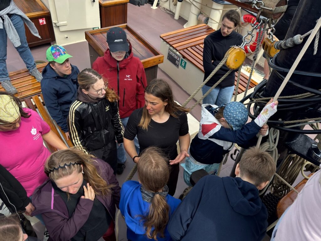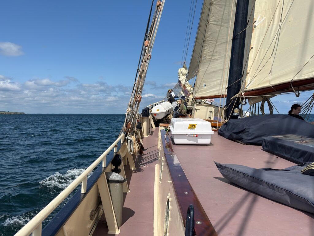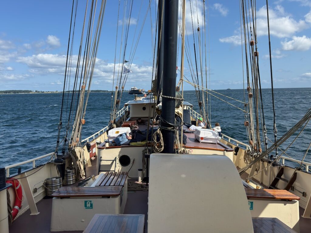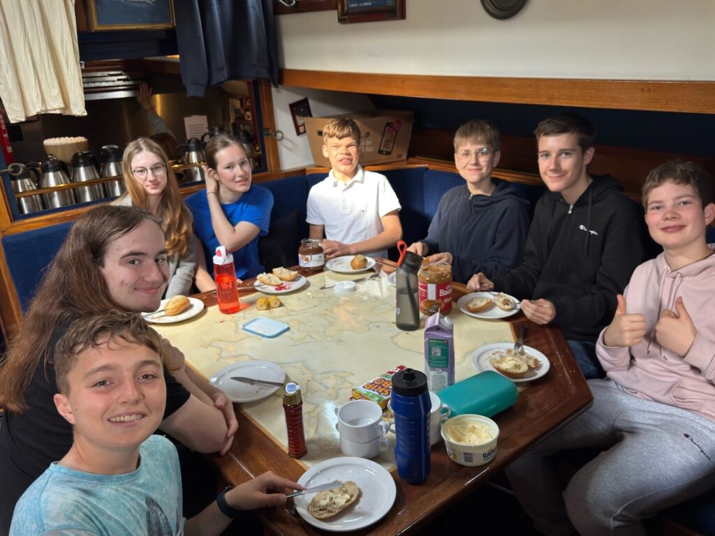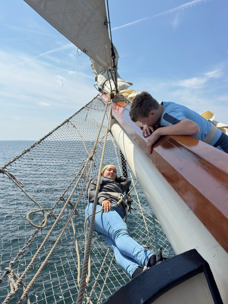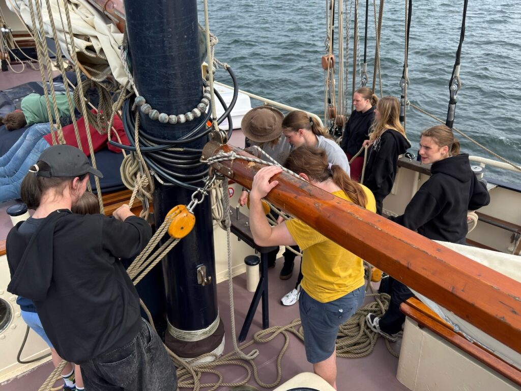 Am nächsten Tag ging es dann endlich so richtig los. Nach dem Frühstück und einer kurzen Einweisung durch die Skipperin Hanna verließen wir den Hafen von Kiel. Zunächst unter Motor, doch kaum waren wir auf offener See, wurden die Segel von uns gehisst. Alle waren eifrig dabei und haben als Team zusammengearbeitet. Mit bis zu 6,8 Knoten, was 12,6 km/h entspricht, ging es Richtung Kappler Hafen. Trotz Seegang und Schräglage, die das Mittagessen für das Koch- und Abwaschteam unter Deck zur Herausforderung machten, war die Stimmung hervorragend.