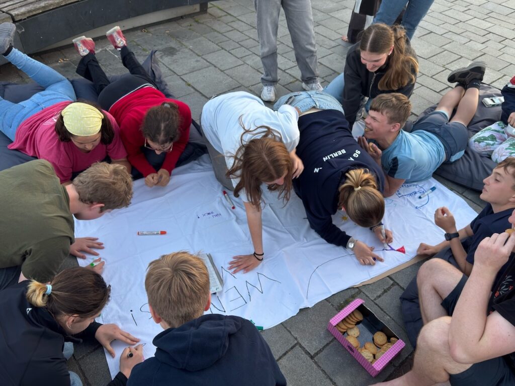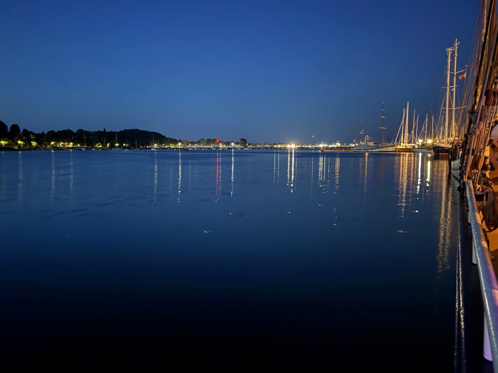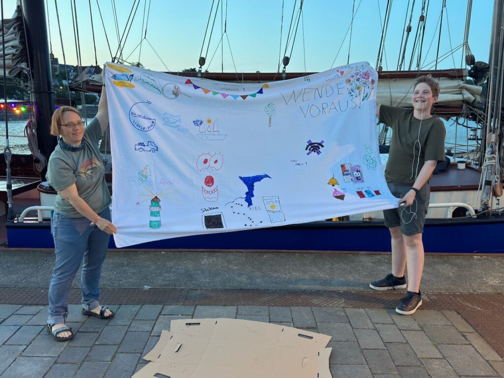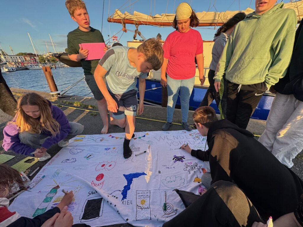 In den nächsten Tagen segelten wir bei unterschiedlichen Windverhältnissen über Eckernförde bis nach Laboe. Der Wind zwang uns zu mehreren Wenden – das bedeutete Teamarbeit, Koordination und Durchhaltevermögen. In ruhigen Momenten genossen wir das Meer, die Sonne, den Wind und die besondere Freiheit auf dem Wasser. Es wurde viel fotografiert, Logbuch geschrieben, gespielt, Musik gehört und gelacht. Zu Reflexion über die Fahrt und umeinander besser zu verstehen haben wir abends im Hafen Gruppenaktivitäten, wie Vorstellung des Logbuchs, Bemalen einer gemeinsamen Flagge oder Vorstellung der eigenen Gefühle, bzw. Gemütszustände, durch Gefühlskarten, unternommen. So kam die ganze Gruppe von 24 Leuten jeden Tag zusammen, um gemeinsam etwas Verbindendes zu schaffen.
