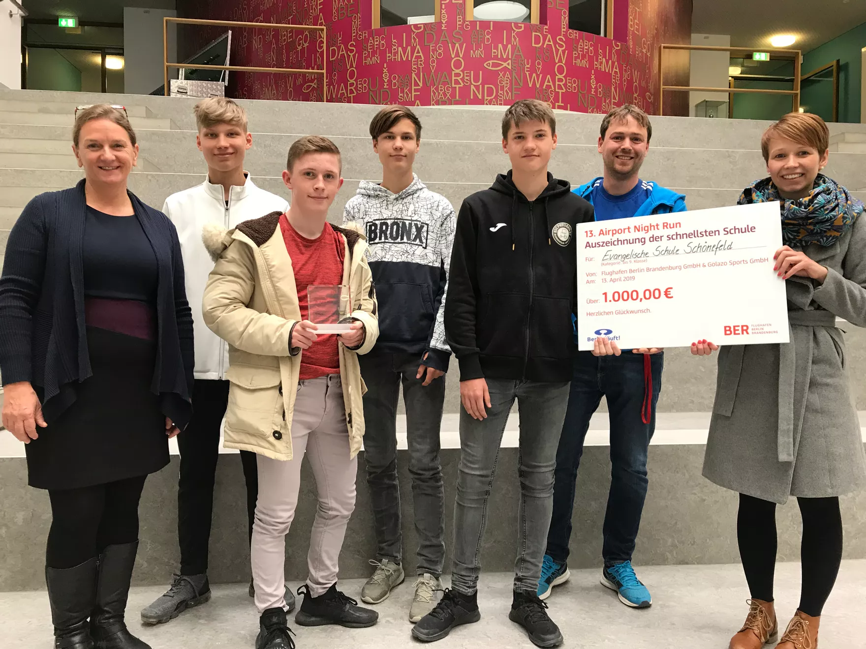 Schulstaffel Sieger beim Airport Night Run 2019. Auch 2019 fand mit über 6000 Teilnehmern der Airport Night Run am neuen Flughafen in Schönefeld statt. Mit einer tollen Leistung schaffte es unsere Schulstaffel bei den 4x4km alle regionalen Schulen abzuhängen und sich die 1000€ Spende für unsere Schule zu sichern!